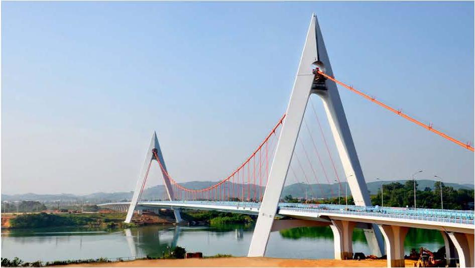 柳州雙擁大橋是國內首座單索面懸索橋,加勁梁采用三跨連續(xù)結構,跨徑組合為40+430+40m。全橋僅對應橋軸線設置單根主纜,靠近橋塔設置5對“人”字形斜吊索,其余位置均布置豎直吊索。本橋成功解決了單主纜不能提供抗扭剛度的技術難題,保證了偏載時的可靠性和抗風穩(wěn)定性。橋型優(yōu)美、行車視野開闊,已成為柳州一景。