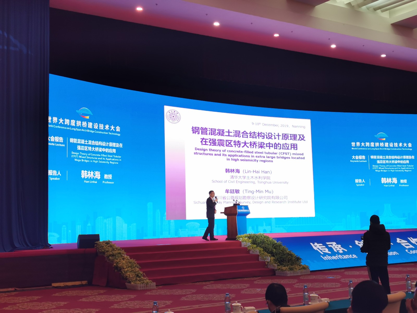 會(huì)上牟廷敏總工作了主題為“超500m跨鋼管混凝土拱橋技術(shù)挑戰(zhàn)與發(fā)展”的專家學(xué)術(shù)報(bào)告,報(bào)告圍繞超500m跨鋼管混凝土拱橋的發(fā)展基礎(chǔ)、所面臨的技術(shù)挑戰(zhàn)、已獲得的技術(shù)成果和后續(xù)的發(fā)展展望等內(nèi)容展開,為與會(huì)代表獻(xiàn)上一場學(xué)術(shù)盛宴。隨后清華大學(xué)韓林海教授聯(lián)合牟總作了主題為“鋼管混凝土混合結(jié)構(gòu)設(shè)計(jì)原理及在強(qiáng)震區(qū)特大橋梁中的應(yīng)用”的聯(lián)合報(bào)告,報(bào)告內(nèi)容包含桁式鋼管混凝土結(jié)構(gòu)設(shè)計(jì)原理、鋼管混凝土加勁混合結(jié)構(gòu)設(shè)計(jì)原理以及強(qiáng)震區(qū)特大橋梁示范應(yīng)用等基礎(chǔ)研究成果和工程應(yīng)用。兩次報(bào)告充分展示了我公司近年來在拱橋建設(shè)領(lǐng)域取得的突出成就,令國內(nèi)外與會(huì)者印象深刻。公司參會(huì)人員全程觀摩了學(xué)術(shù)報(bào)告,通過與同行就當(dāng)今拱橋建設(shè)前沿科學(xué)、技術(shù)熱點(diǎn)問題等展開交流,提高了對拱橋前沿進(jìn)展的認(rèn)識(shí)、開拓了拱橋的設(shè)計(jì)和研究思路。