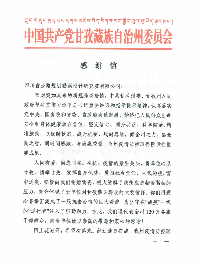 我公司在新冠肺炎疫情防控期間,積極發(fā)揮自身優(yōu)勢,勇?lián)鐣?zé)任,對甘孜州捐贈了抗疫物資。3月18日,甘孜州委、州人民政府送來感謝信,對我公司在抗擊疫情的緊要關(guān)頭,心系甘孜、情牽甘孜,積極捐獻、火速馳援的義舉表示感謝。