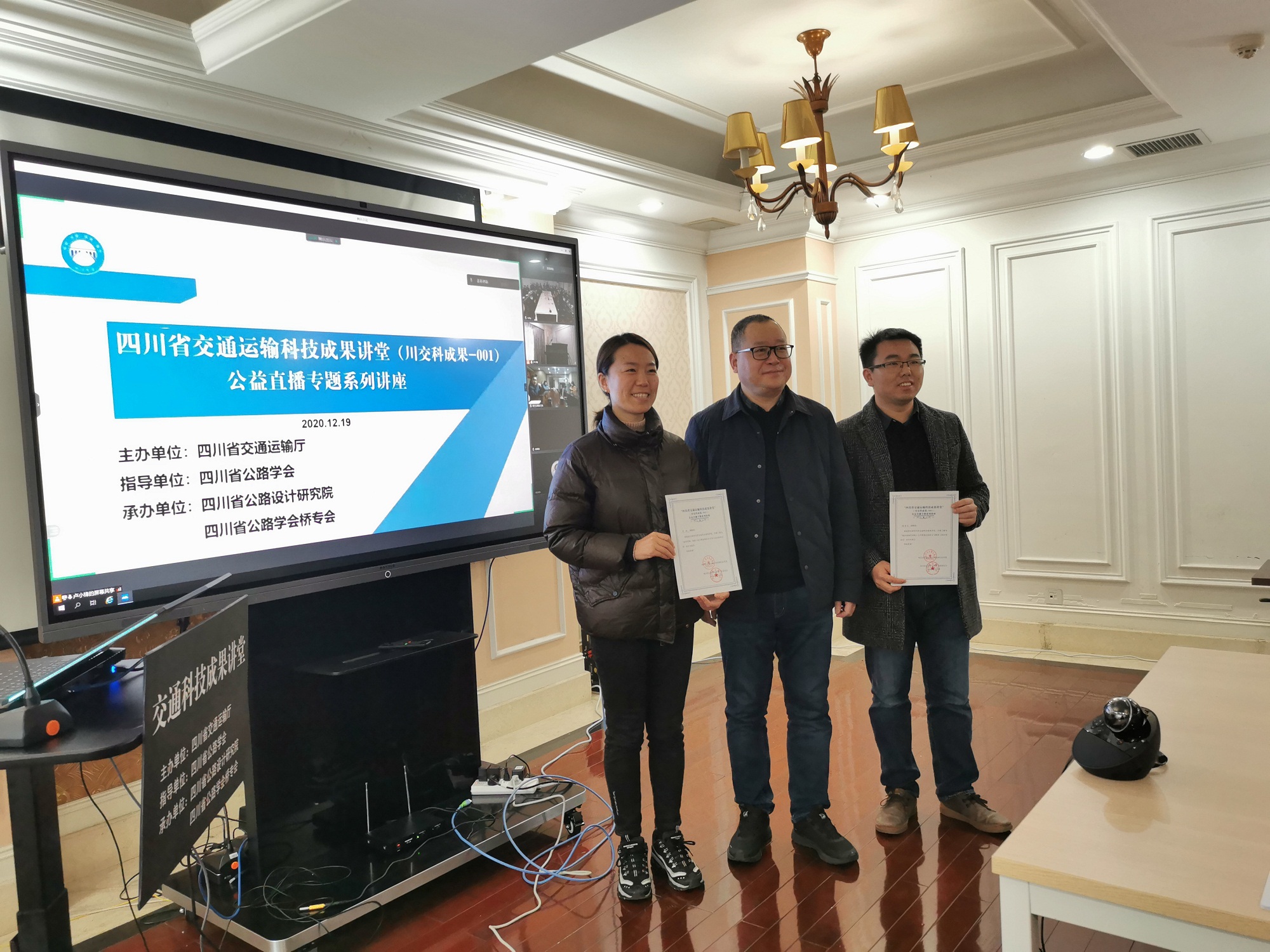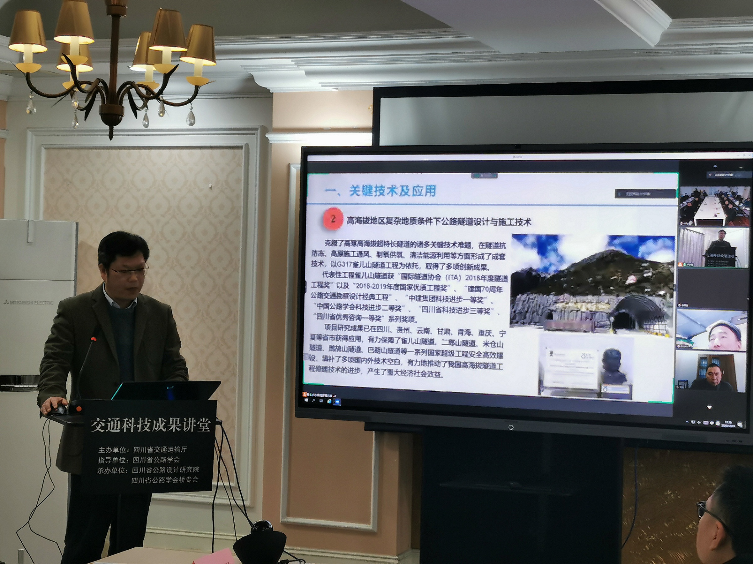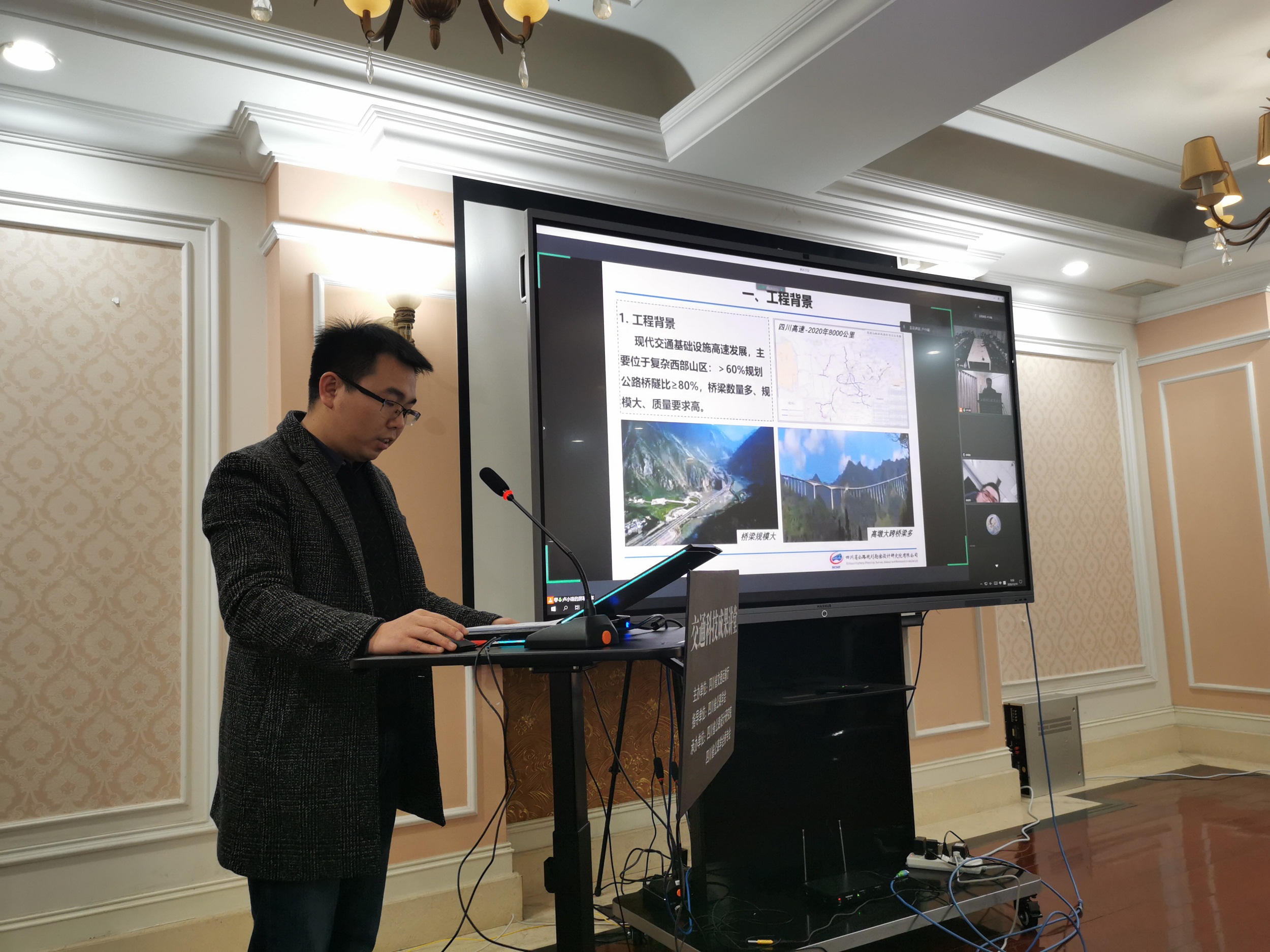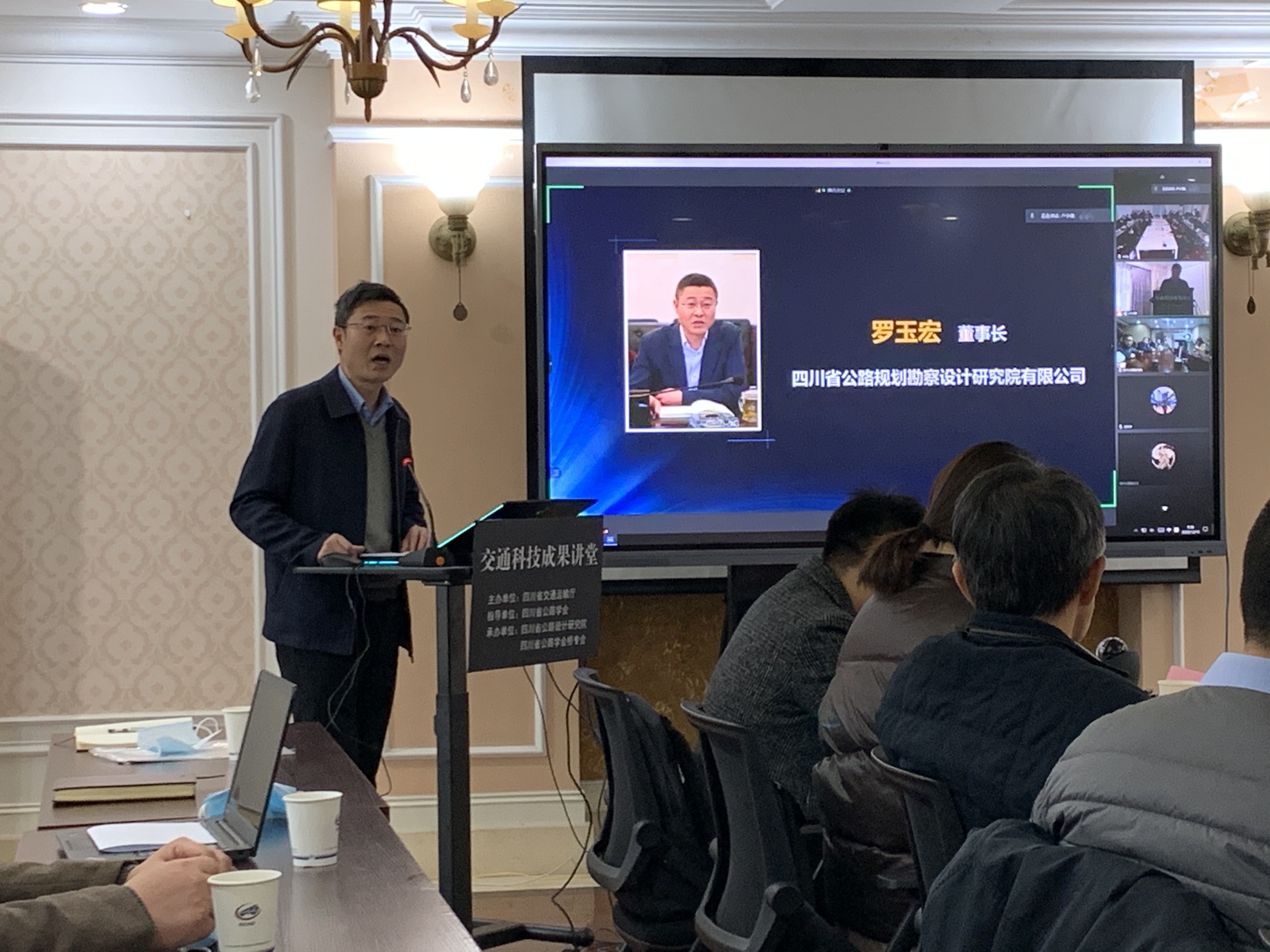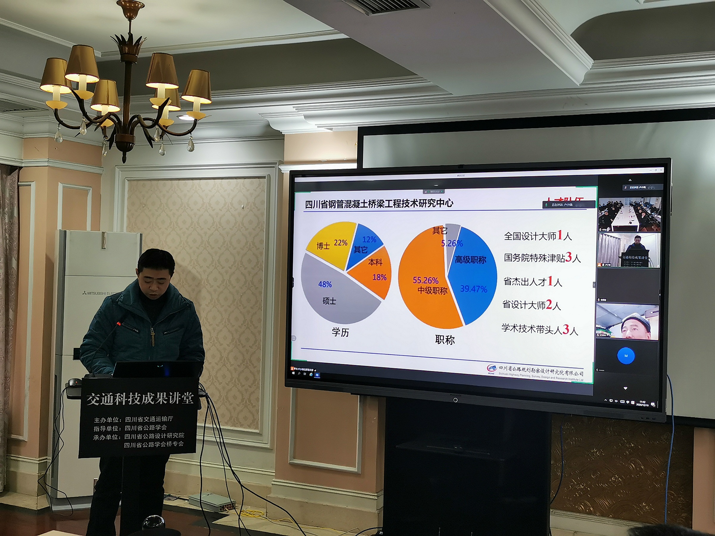 12月19日上午,由四川省交通運輸廳主辦、我公司和橋專會共同承辦的四川省交通運輸科技成果講堂(川交科成果-001)公益直播專題系列講座在我公司成功召開。本次會議采用線上直播和小規(guī)模現(xiàn)場會議方式同時進行,現(xiàn)場會議到會指導的領導有省交通運輸廳科技和信息化處處長柏吉瓊,四川省公路學會理事長李全文,公司黨委書記、董事長羅玉宏。本次交通運輸科技成果講堂上網點數超過160個,參加總人數約300人。
