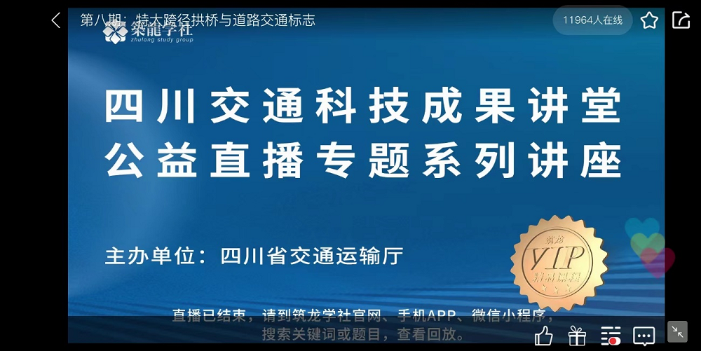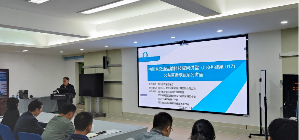 2023年11月11日,由四川省交通運輸廳主辦,我公司承辦,四川省橋梁與結(jié)構(gòu)工程實驗室、四川省鋼管混凝土橋梁工程技術(shù)研究中心、四川交通職業(yè)技術(shù)學(xué)院、四川省交通運輸標準化技術(shù)委員會協(xié)辦的四川省交通運輸科技成果講堂(川交科成果-017)公益直播專題系列講座在四川省橋梁與結(jié)構(gòu)工程實驗室成功舉辦,本期是“低碳橋梁與材料技術(shù)專場”系列講座—主題為特大跨徑拱橋與道路交通標志,會議采用線上直播和現(xiàn)場會議方式進行,并經(jīng)多平臺轉(zhuǎn)播,共吸引了公路行業(yè)建設(shè)、運營、設(shè)計、科研、施工等單位近13000人參加。