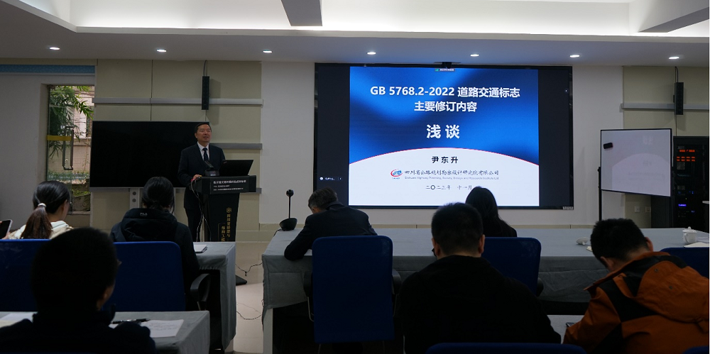 我公司交通安全分院院長、教授級高工尹東升作了《GB 5768.2-2022 道路交通標志主要修訂內(nèi)容淺談》專題報告。解讀了道路交通標志的要素、標準修訂內(nèi)容等,傳授了國家規(guī)范的深度理解和消化,更加準確的掌握道路交通標志標線的使用原則、適用范圍和注意事項。