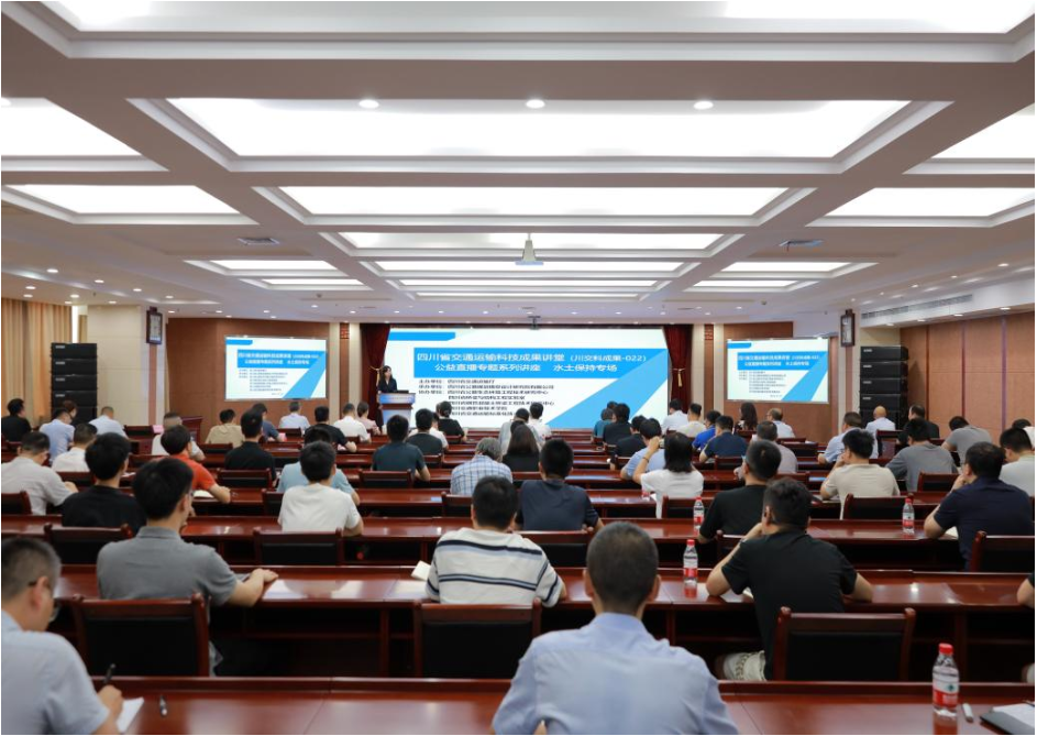 在全省交通運輸行業(yè)深入學習貫徹黨的二十屆三中全會精神,因地制宜發(fā)展新質(zhì)生產(chǎn)力之際,7月22日,由四川省交通運輸廳主辦,公司承辦、四川省公路生態(tài)環(huán)境工程技術研究中心(以下簡稱生態(tài)環(huán)境工程中心)等單位協(xié)辦的四川省交通運輸科技成果講堂(川交科成果-022)公益直播專題系列講座(水土保持專場)在廳四樓大會議室成功舉辦。省交通運輸廳副廳長李紅、建管處處長趙剛、科信處處長鐘映梅、規(guī)劃處副處長張靜,蜀道集團安環(huán)部、公路建管部等部門及川高公司、成渝公司、蜀高公司等建設單位,公司總工辦、科信部、環(huán)境分院等生產(chǎn)部門相關領導及技術人員100余人在現(xiàn)場參加講座。交通科技成果講堂開場環(huán)節(jié)由公司總工程師牟廷敏主持,講座環(huán)節(jié)由生態(tài)環(huán)境工程中心主持。