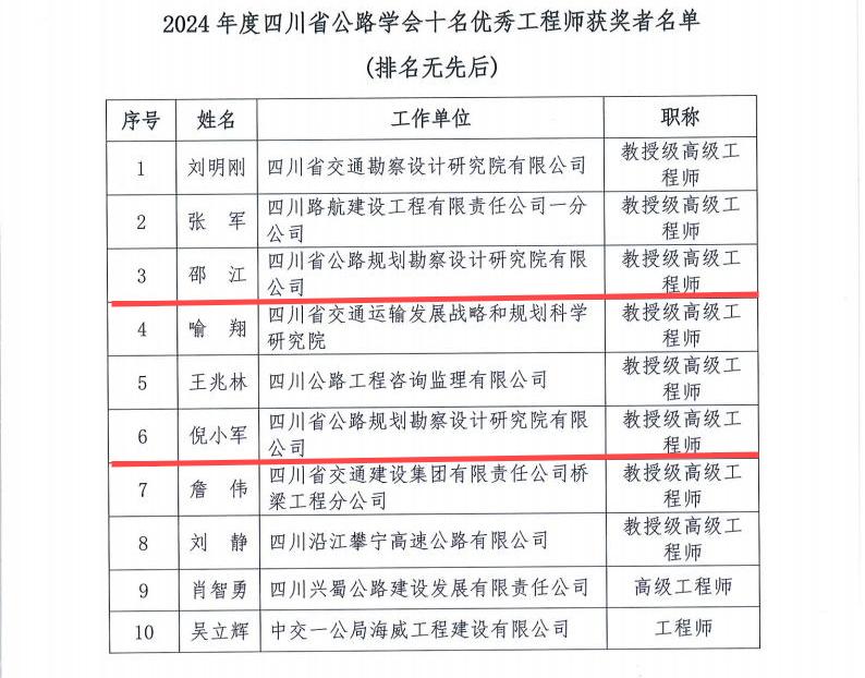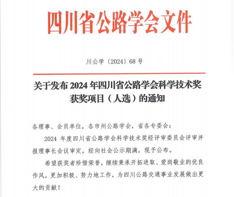 根據(jù)四川省公路學(xué)會《關(guān)于發(fā)布2024年四川省公路學(xué)會科學(xué)技術(shù)獎獲獎項目(人選)的通知》(川公學(xué)〔2024〕68號)的文件,我公司邵江、倪小軍等2位同志獲評“十名優(yōu)秀工程師”稱號,肖莉、周水文等2名同志獲評“優(yōu)秀科技工作者”稱號,楊楓、蔣瑜陽、狄秉臻等3名同志獲評“青年科技獎”。特此祝賀!
