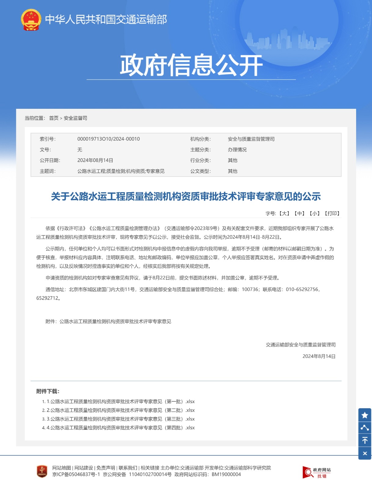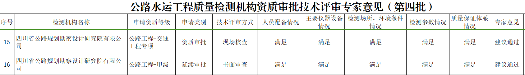 8月14日,交通運(yùn)輸部發(fā)布《關(guān)于公路水運(yùn)工程質(zhì)量檢測(cè)機(jī)構(gòu)資質(zhì)審批技術(shù)評(píng)審專(zhuān)家意見(jiàn)的公示》,我司申請(qǐng)的公路工程-交通工程專(zhuān)項(xiàng)、甲級(jí)資質(zhì)公示通過(guò)。