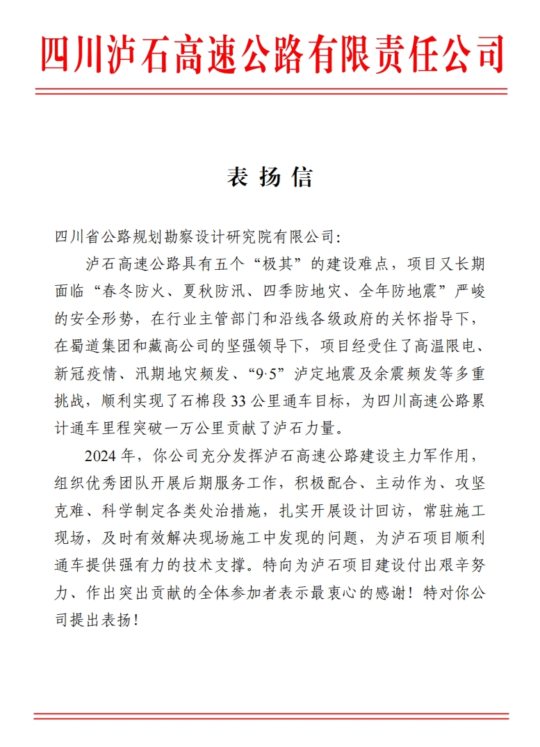 業(yè)主在表揚(yáng)信中指出,我公司充分發(fā)揮瀘石高速公路建設(shè)主力軍作用,組織優(yōu)秀團(tuán)隊(duì)開展后期服務(wù)工作,積極配合、主動作為、攻堅(jiān)克難、科學(xué)制定各類處治措施,扎實(shí)開展設(shè)計(jì)回訪,常駐施工現(xiàn)場,及時(shí)有效解決現(xiàn)場施工中發(fā)現(xiàn)的問題,為瀘石項(xiàng)目順利通車提供強(qiáng)有力的技術(shù)支撐。