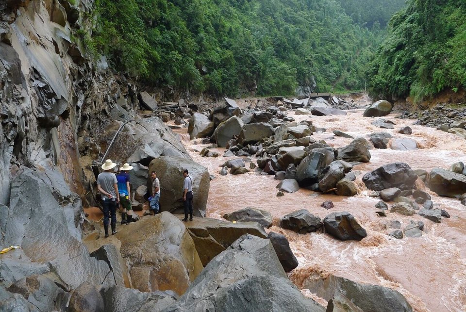 8月17日清晨6:00,搶險(xiǎn)小組出發(fā)前往災(zāi)區(qū)現(xiàn)場(chǎng),到達(dá)災(zāi)區(qū)后立即開(kāi)始進(jìn)行踏勘排查。由于道路被泥石流及滑坡沖毀嚴(yán)重,局部路段被完全掩埋,靠山側(cè)堆滿厚厚的泥漿,靠河側(cè)則是臨河懸空陡壁,高差約10至20米,大家只能行走在很窄的原路混凝土護(hù)欄頂部,加之路面濕滑,稍不注意就會(huì)掉入山谷。不僅如此,靠山側(cè)邊坡巖土松動(dòng),崩塌落石時(shí)有發(fā)生,大家通過(guò)時(shí)必須高度警惕、相互提醒,觀察無(wú)異常后快速通過(guò)。同時(shí),多數(shù)臨河路段擋墻被沖毀,路面板大面積懸空,根據(jù)調(diào)查需要,必須在懸空面板上進(jìn)行實(shí)地調(diào)查及測(cè)量,隨時(shí)面臨路面板垮塌掉落的危險(xiǎn)。搶險(xiǎn)小組幾位成員都有不同程度的擦傷扭傷。
