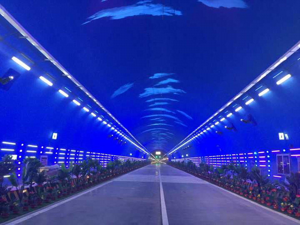 六盤山超特長隧道是高瓦斯、軟弱圍巖超特長雙線隧道,隧道設(shè)斜井兩座,1號斜井1160米,優(yōu)化后的2號斜井長1362米。隧道正線共設(shè)人行、車行橫洞14個(gè)、緊急停車帶左右線各14個(gè),為避免駕駛員與乘客在超長隧道內(nèi)駕乘疲勞,在隧道左右線中部各設(shè)置了一處長200米的特殊燈光照明帶,通過不同燈光圖案(上行線為海底世界、下行線為藍(lán)天白云)的變化與調(diào)整將隧道分為兩段,在特殊燈光帶兩側(cè)實(shí)施生態(tài)綠化景觀建設(shè),以提高車輛行駛中乘客視覺的舒適感,降低行駛過程中的疲勞感,力爭實(shí)現(xiàn)車在路上行,人在畫中游的和諧景象。