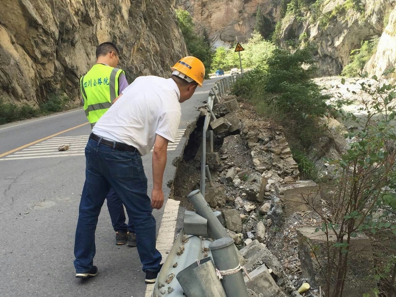 8月9日,我院派出的第一批抗震救災小組,分成路基地質和橋隧兩隊,完成了G247平武-雙河-川甘界、G544雙河-九寨溝縣現(xiàn)場踏勘,重點對沿線橋梁、隧道、邊坡等結構物進行應急調查,累計踏勘里程90公里,完成20個地質災害點、60余座橋梁、4座隧道的應急檢測。各地質災害點均為原有病害,其中4處受地震影響加劇出現(xiàn)崩塌落石;橋梁、隧道震害較輕??傮w上道路具備通行能力,各地災點可采用加強觀測、統(tǒng)籌預留設備保障通行。此外,我院調取歸檔的川九公路全套設計圖,收集制作《臨時鋼棚架設計圖》、《“8.8”九寨溝地震震區(qū)路網示意圖》、《川九路路線方案示意圖》,為災區(qū)道路搶通保通提供了有力保障。