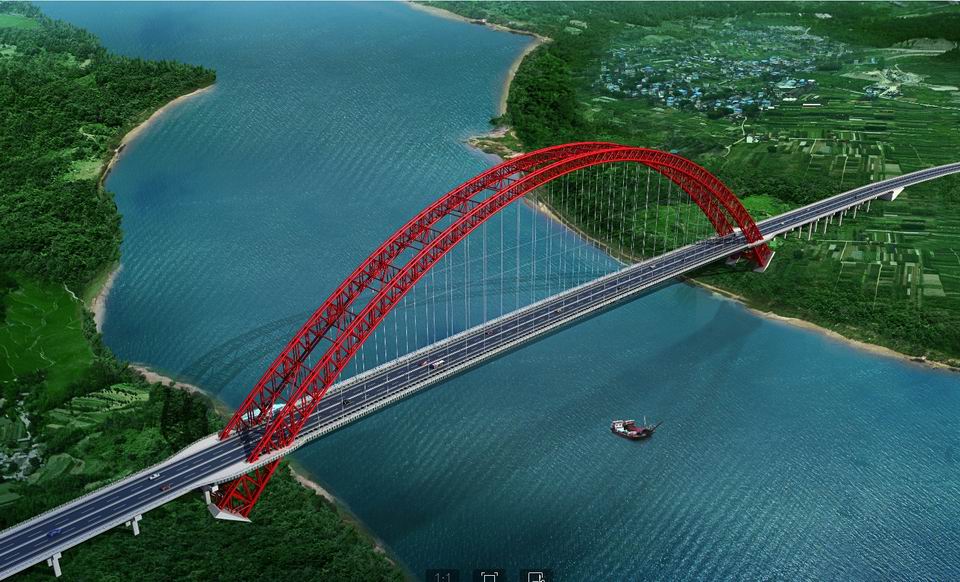 平南三橋?yàn)槔笃种劣窳指咚俟菲侥媳被ネㄟB接線上跨越潯江的一座特大橋。該橋初步設(shè)計(jì)通過懸索橋、斜拉橋和拱橋比較,因?yàn)榘踩雀?、工程造價(jià)低、施工風(fēng)險(xiǎn)少、使用性能優(yōu)良等原因,推薦采用主跨574m中承式鋼管混凝土拱橋。鑒于推薦的鋼管混凝土拱橋跨度大、支撐技術(shù)新的特點(diǎn),我院開展了針對(duì)推薦方案與斜拉橋方案比選的技術(shù)設(shè)計(jì)。