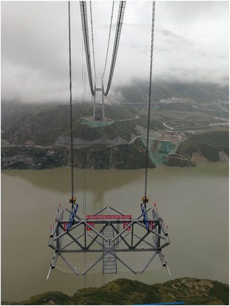 該橋是主跨1100米的超大跨懸索橋,被譽為“川藏第一橋”。主梁用鋼量為9095噸,采用型鋼桁架,為帶豎腹桿的華倫式結(jié)構(gòu),桁寬27m、桁高8.2m;主梁節(jié)間長(橫梁間距)10m。橋道系采用縱向工字梁與混凝土橋面板的鋼-混組合結(jié)構(gòu)形式。