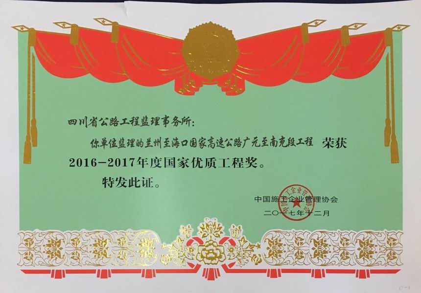 近日,經(jīng)中國施工企業(yè)管理協(xié)會評選,我院監(jiān)理事務(wù)所監(jiān)理的蘭州至??趪腋咚俟窂V元至南充段工程,榮獲“2016-2017年度國家優(yōu)質(zhì)工程獎”,1名同志被授予“2016-2017年度國家優(yōu)質(zhì)工程獎突出貢獻(xiàn)者”榮譽(yù)稱號。我院將繼續(xù)探索創(chuàng)新先進(jìn)的質(zhì)量管理經(jīng)驗,大力弘揚(yáng)工匠精神,追求卓越,鑄就經(jīng)典,牢固樹立質(zhì)量第一意識,認(rèn)真貫徹實(shí)施質(zhì)量強(qiáng)國戰(zhàn)略,為四川交通建設(shè)貢獻(xiàn)更大力量。