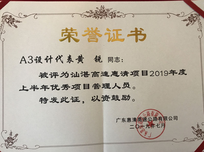 8月29日,廣東惠清高速公路有限公司對(duì)汕湛高速惠清項(xiàng)目2019 年上半年優(yōu)勝單位及優(yōu)秀管理人員進(jìn)行了表彰,我公司設(shè)計(jì)代表黃銳同志被表彰為“優(yōu)秀管理人員”。