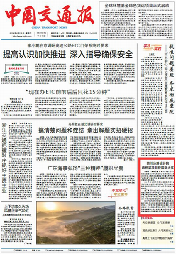 6月18日,《中國交通報》頭版以“四川公路設計院兩橋梁項目獲國際大獎”為題報道了合江長江一橋、瀘定大渡河大橋分別獲得國際橋梁大會喬治•理查德森獎和古斯塔夫•林德撒爾獎的消息。報道了牟廷敏總工領獎,并對兩個獲獎項目設計創(chuàng)新作了簡要介紹?!吨袊煌ㄐ侣劸W》進行了同步報道。網址如下: