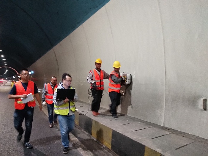 我院隧道檢測人員攜帶高空作業(yè)車、地質(zhì)雷達(dá)、鉆芯機(jī)等專業(yè)設(shè)備,配備了安全作業(yè)保障隊(duì)伍,通過合理組織和周密安排,不辭辛勞、克服困難,全面高質(zhì)量完成該隧道的專項(xiàng)“體檢”外業(yè)任務(wù),為查明該隧道的病害成因、程度、分布等采集了詳實(shí)的現(xiàn)場數(shù)據(jù),為下階段的維修處治方案設(shè)計(jì)提供基礎(chǔ)依據(jù)。